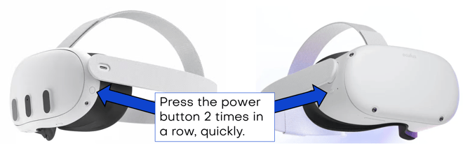 Performing a quick double-click on the power button initiates a headset reset. During this time, a brief black screen may appear for a moment. Once the reset is complete, your VR hands and controllers will sync up, allowing you to proceed with your procedure. This works for both Quest 2 and Quest 3 headsets.