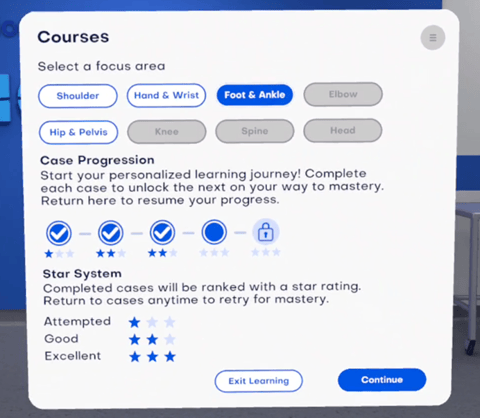 Discover how Courses in FractureLab provide a structured, guided learning path through surgical training. Learn how this feature helps you progress from foundational skills to advanced procedures while tracking your performance and saving your progress between sessions.